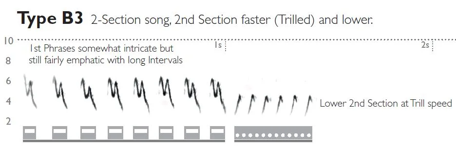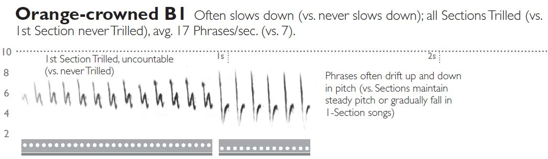 Many Orange-crowned songs have a similar form: 2 Sections, the second lower. However the speed is much different. Both Sections are so fast that it would be impossible to imagine counting the number of Elements. This characteristic: that all Sections of this species’ songs are sung at trill speed is a very good ID point.